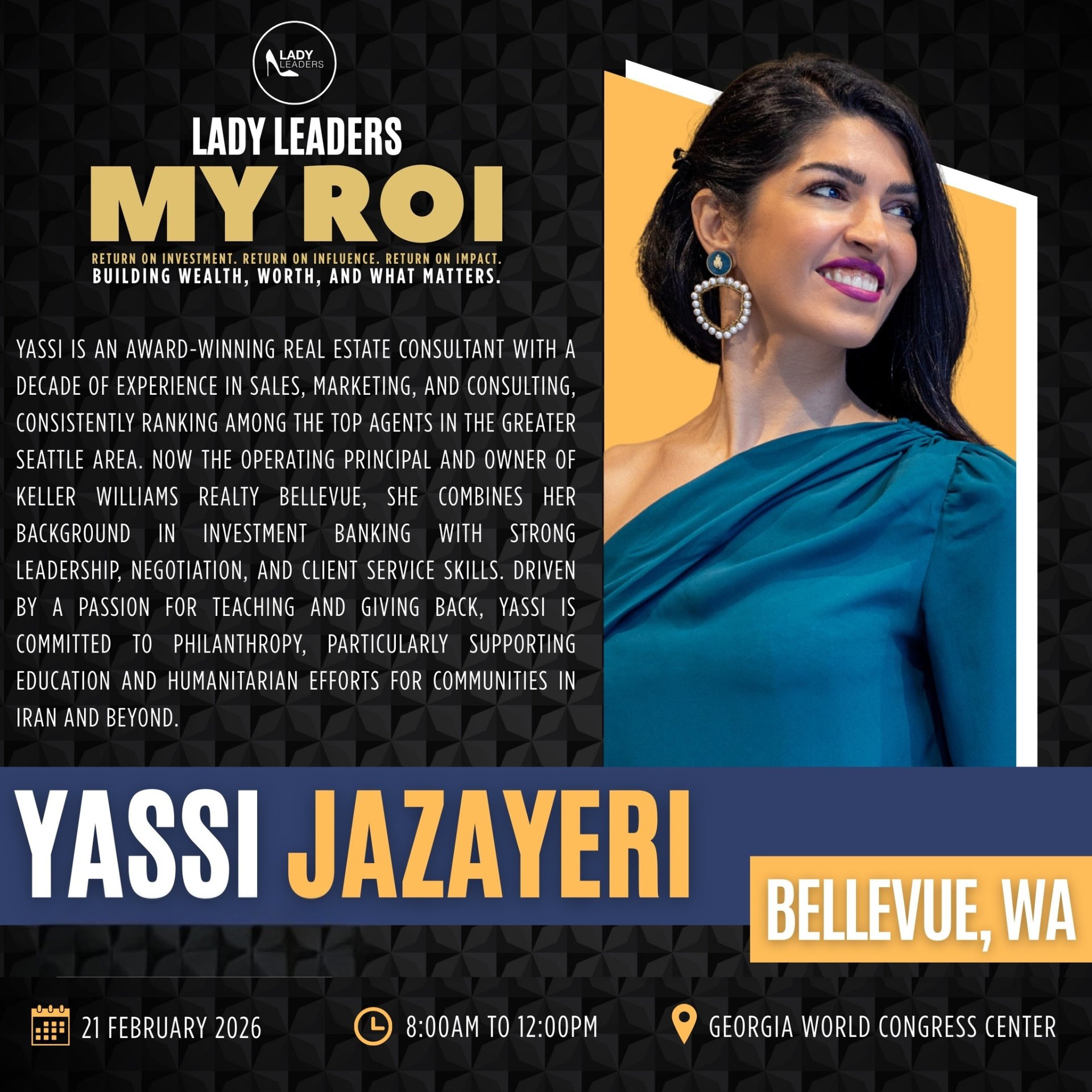 I will be returning to the stage this year with Lady Leaders, sharing my heart and story on the theme of My ROI. For me, success was never measured by income, it’s measured by impact. Real estate has been the vehicle, but significance has always been the destination. Since I've started my journey in building wealth through real estate, it has granted me the privilege to turn "success" into significance. I am proud to share that I've been able to sponsor 23 students to go to school, built 7 schools in my home country of Iran, contributed over $100,000 to charitable foundations, and have dedicated my whole life to activism within the Persian community.